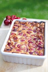 - Répartir les cerises dénoyautées dans un plat à gratin (ou dans des moules à crème brûlée individuels). Verser l’appareil à clafoutis dans le plat et enfourner pour 45 min de cuisson.