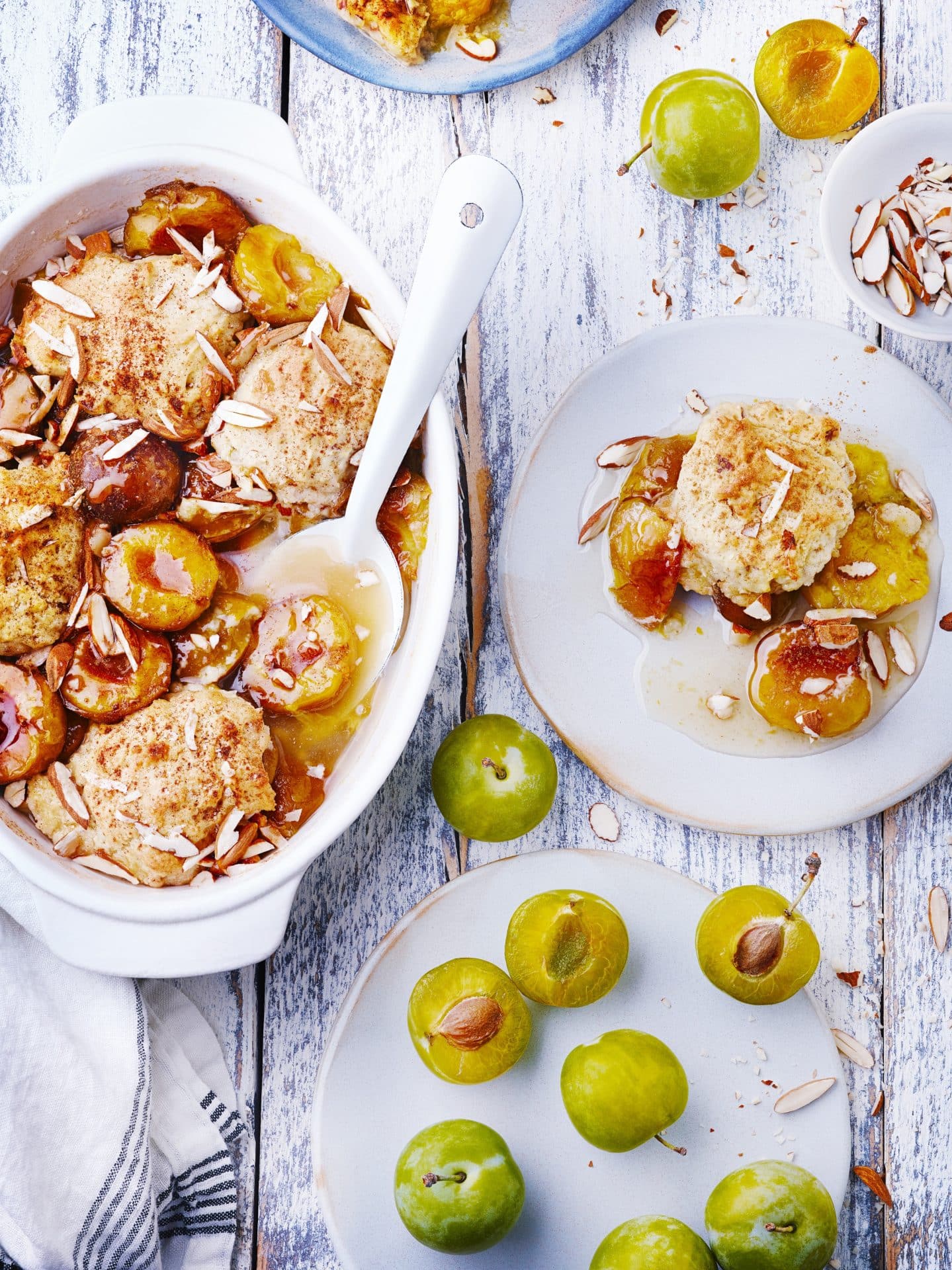 - Versez des cuillerées de pâte sur les prunes, parsemez du reste des amandes grossièrement concassées et d’un peu de cannelle. Placez le plat au four pour 25 minutes de cuisson. Servez tiède.