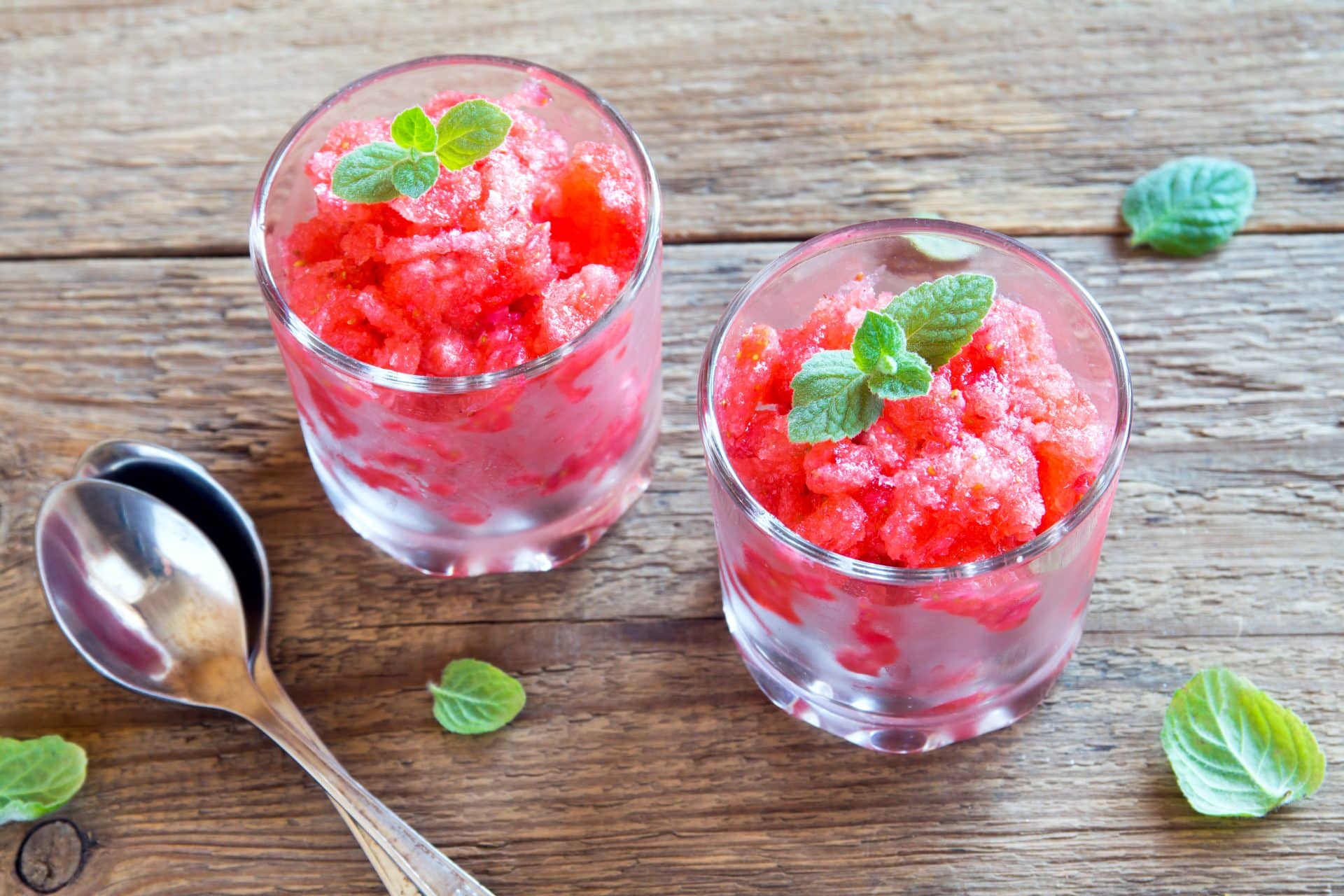 - Répartir le coulis de fraises dans des verres de service. Ajouter du granité de melon et décorer, juste avant de servir, d'un nuage de de Chantilly.