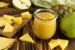 Eplucher l'ananas, et le couper en quatre dans le sens de la longueur. Retirer le « bois » (le centre). Couper chaque morceau en petits dés.