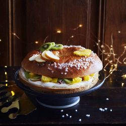 - Tartiner la base de la couronne avec le fromage frais parfumé et garnir de fruits émincés. Refermer la couronne en plaçant la seconde partie de la couronne dessus. *au besoin replacer la fève dans la base de la couronne si elle est tombée au moment de la découpe.
