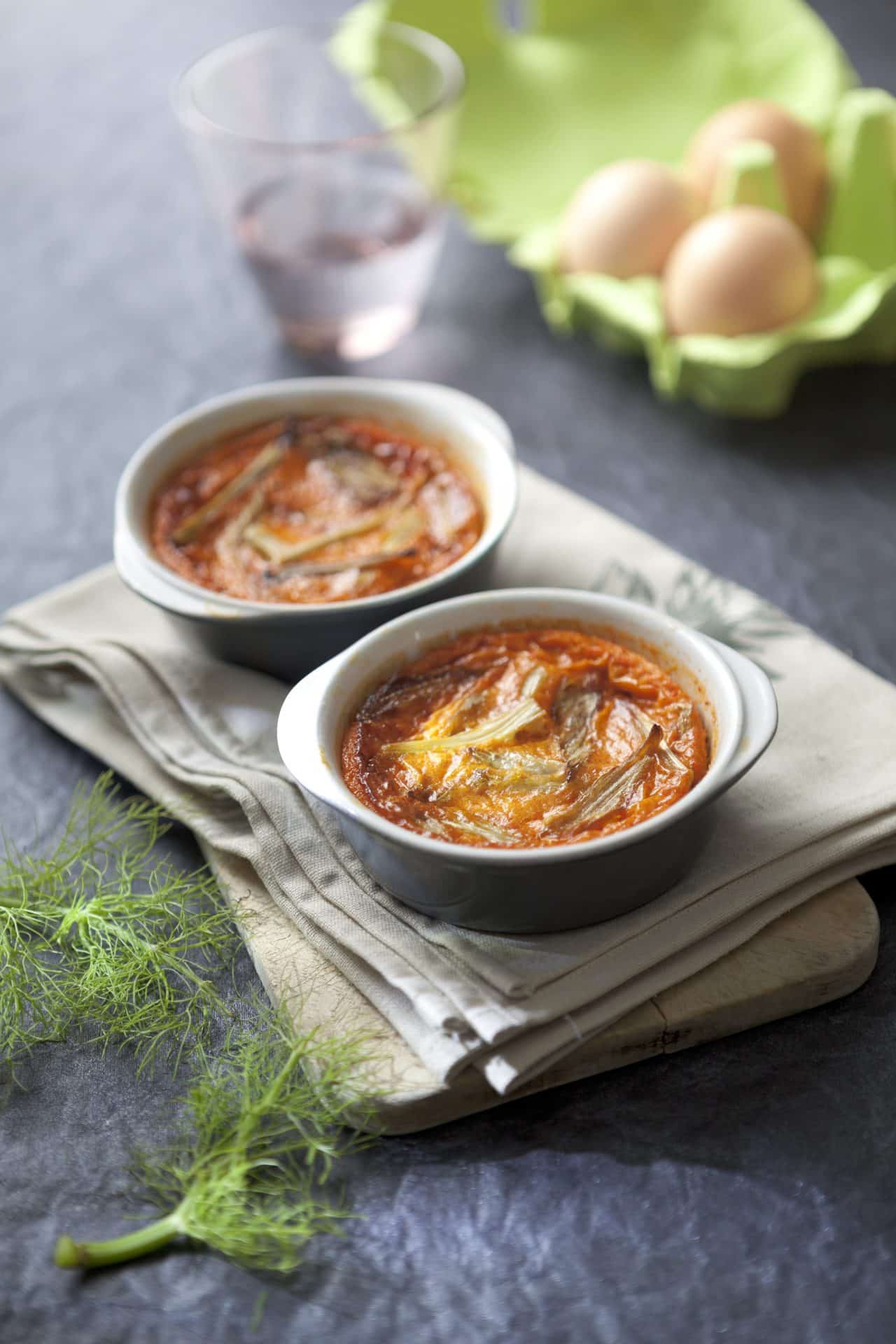 - Répartir le fenouil dans 4 moules à crème brûlée et verser la préparation au poivron par-dessus. Cuire au four au bain-marie à 100°C durant 40 à 45 minutes.