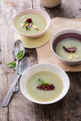- Servir la crème d'asperge décorée de chips de canard fumé.