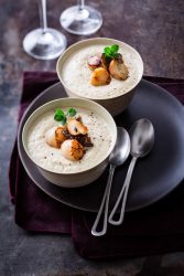 - Servir la crème d'endives dans des bols. Déposer des noix de Saint Jacques et des champignons puis parsemer d'origan ciselé.