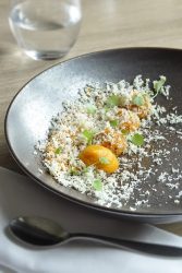 - Verser la crème de carottes dans une poche à douille et garnir une partie de l’assiette de petits monticules de cette préparation.