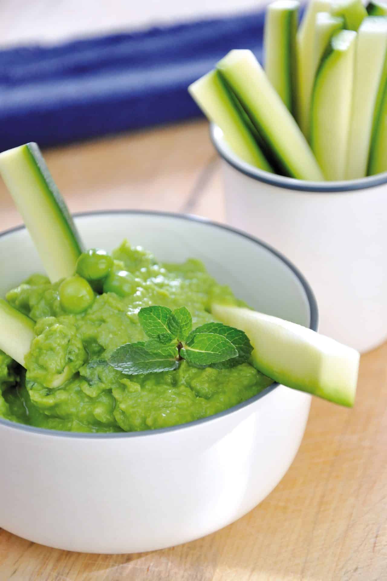 Déguste la crème de petits pois à la menthe en trempant dedans les bâtonnets de courgette.