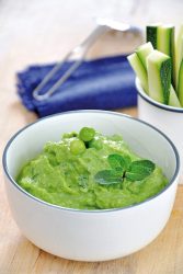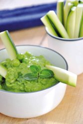 - Déguste la crème de petits pois à la menthe en trempant dedans les bâtonnets de courgette.