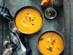 - Servir dans des bols ou assiettes creuses avec un filet de lait de coco ou de crème et parsemer de graines de courge.