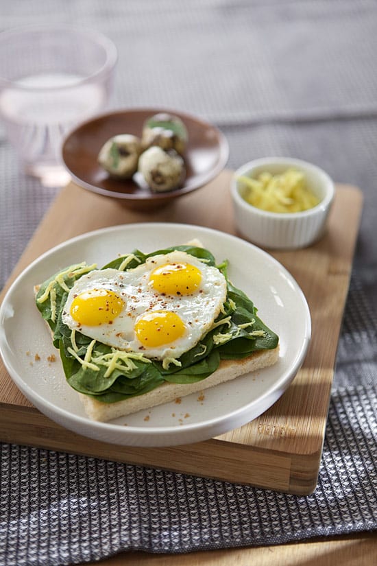- Dresser les toasts : déposer sur chaque toast un peu d'épinards au gingembre et 3 œufs de caille au plat.