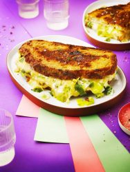 - Déposez les 4 tranches de pain sur une planche et étalez le beurre sur les tranches. Retournez les tranches de pain et étalez 1 c. à soupe de crème fraîche sur chaque tranche. Poivrez, répartissez le fromage à raclette. Ajoutez l’émincé de poireau sur 2 des tranches, puis refermez les croques. (Les surfaces beurrées doivent être à l’extérieur).