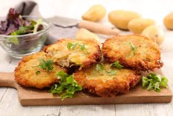 Variante : pour optimiser la texture des galettes, cuire les pommes de terre dans leur peau au four (compter 1 bonne heure de cuisson à 180°C).