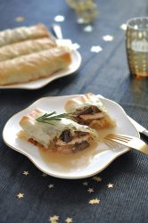 - Placer 1 feuille de pâte filo sur le plan de travail. La plier en deux. Déposer dessus un peu de confit d’oignon, quelques lanières de dinde, des pleurotes sautés et quelques copeaux de truffe. Rouler la pâte autour de ces ingrédients comme un nem.