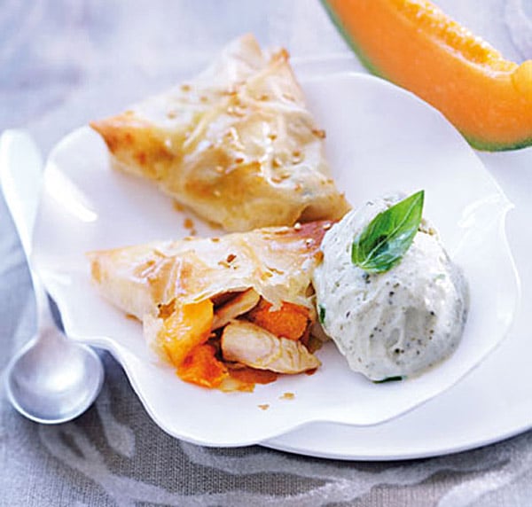 Croustillant de poulet et melon chaud et sa crème glacée au basilic