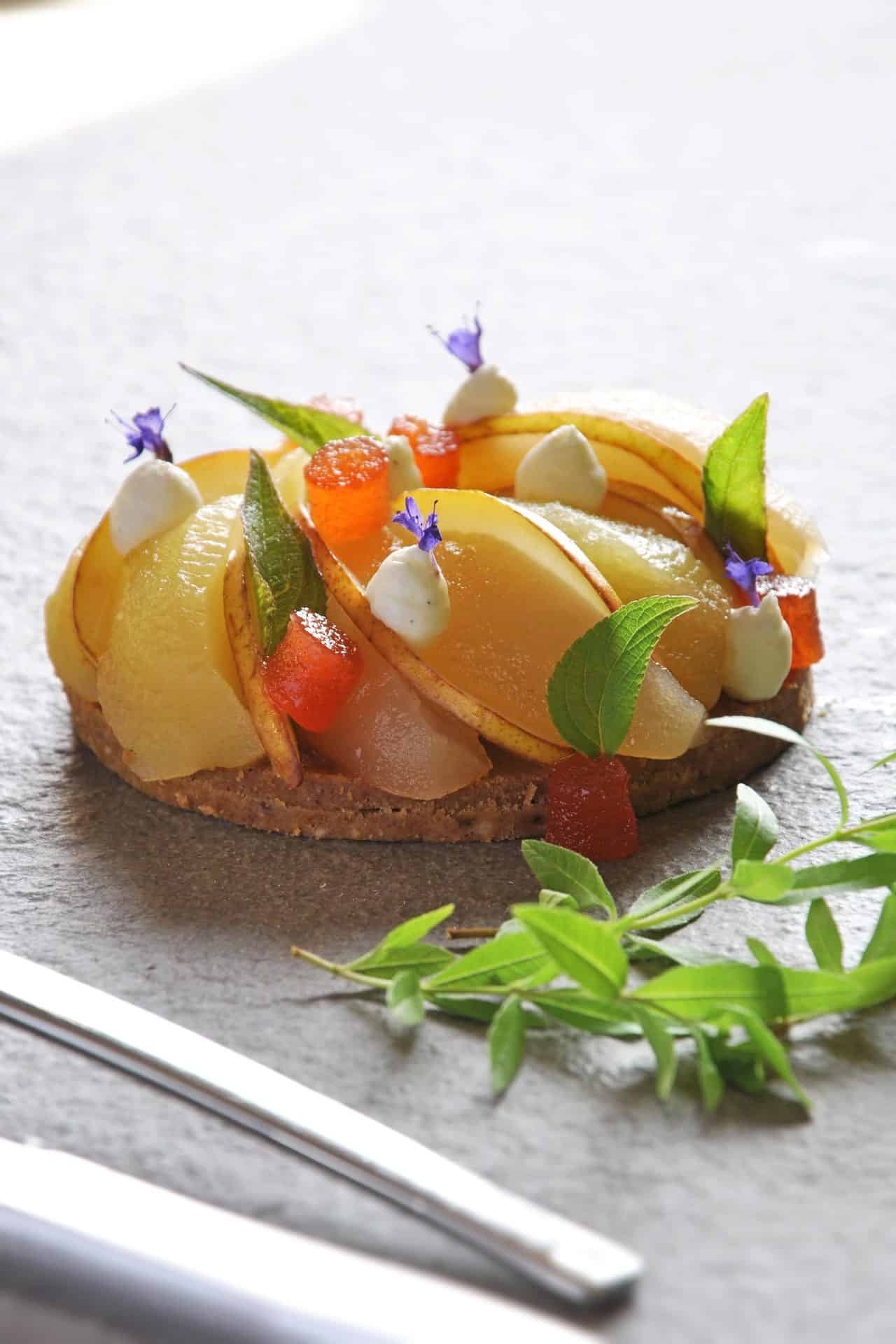 Décorer avec la crème vanillée, les fleurs de bourrache, les amandes fraîches et la ½ poire crue taillée en fines lamelles biseautées.