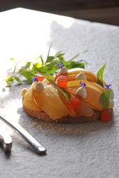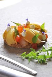 - Décorer avec la crème vanillée, les fleurs de bourrache, les amandes fraîches et la ½ poire crue taillée en fines lamelles biseautées.