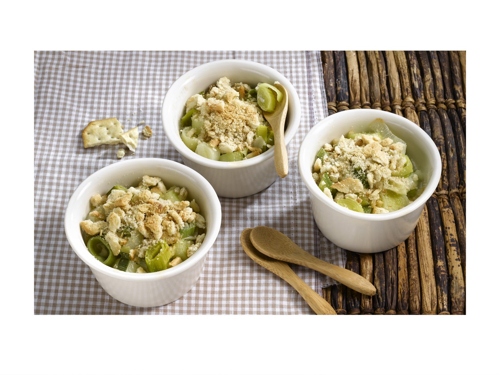 • Ajoute les poireaux cuits puis saupoudre de miettes de biscuits. Passe au four environ 12 min (Th 6/7). Attention à ne pas te brûler en sortant les ramequins du four.