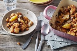 - Recouvrir de pâte à crumble aux Petit Beurre. Enfourner pendant 30 minutes environ à 180°C jusqu’à ce que le crumble soit bien doré et les fruits bien tendres.