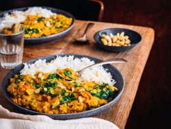 Lavez les épinards frais et ajoutez-les aux lentilles. Poursuivez la cuisson pendant 10 minutes, jusqu’à ce que les épinards soient fondus. Servez chaud, avec du riz et parsemé de noix de cajou concassées.