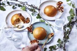 - Faire décongeler les dômes au réfrigérateur et les sortir quelques minutes avant de servir accompagnées de morceaux de nougatine de noisettes