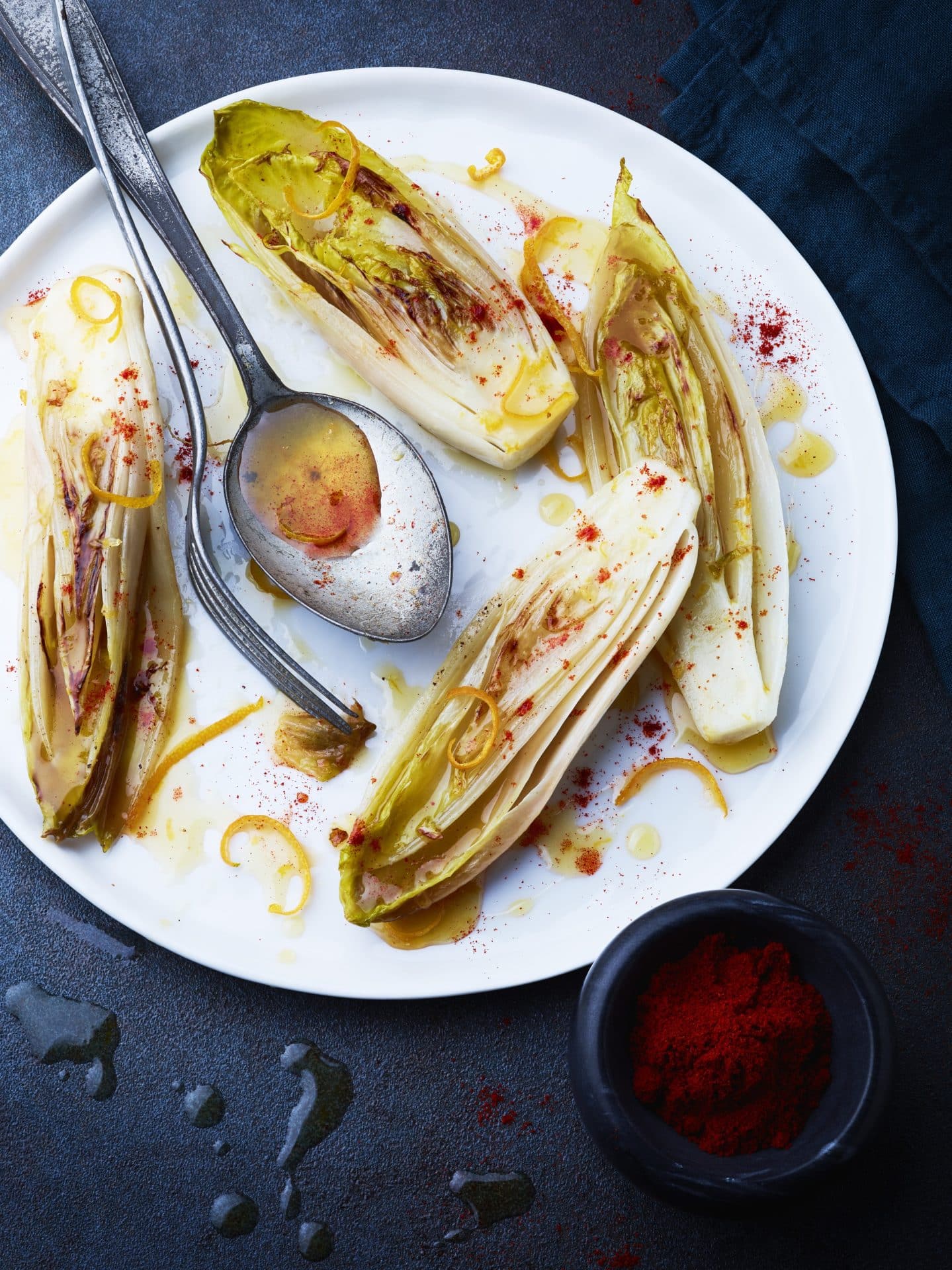 Remettre les endives dans la poêle, ajouter une pincée de piment d’Espelette et mélanger pour les enrober de sauce avant de servir.
