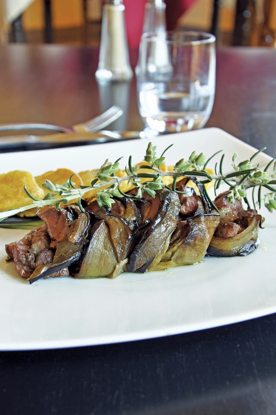 Epaule d’agneau farcie et roulée aux aubergines, jus au romarin