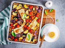 - Dans un grand plat allant au four, répartissez les courgettes, les tomates cerises, l’oignon et les pois chiches. Arrosez avec l’huile d’olive, saupoudrez d’herbes de Provence, de paprika, de sel et de poivre. Mélangez bien. Coupez les blocs de feta en deux et placez-les sur les légumes, poivrez-les.
