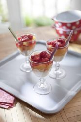 - Dans 4 coupes à fruits, verser le lait d'amande et réserver au frais.