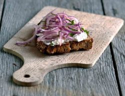 - Garnissez généreusement la tartine de l’oignon ciselé et assaisonné.