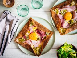 - Dans une grande poêle ou une crêpière, faites chauffer une galette à feu doux. Cassez un œuf au centre, disposez autour du jaune une portion de fondue de poireaux, une demi-tranche de jambon coupée en morceaux et du fromage râpé.