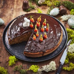 - Napper le gâteau à la carotte de chocolat et laisser refroidir (ou déguster aussitôt !). En option : servir le gâteau simplement accompagné de chocolat fondu. Chaque convive nappera sa part de gâteau à sa guise.