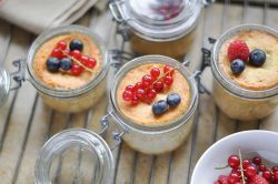 - A la sortie du four, laisser refroidir puis décorer de fruits rouges crus. Fermer les couvercles et distribuer les gâteaux à vos convives avant de partir en pique-nique ! (mieux vaut répartir les charges dans les sacs de pique-nique ; le gâteau en bocal, c’est très chic mais un peu lourd à transporter !).
