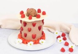 - Déposer la fleur de chocolat blanc au-dessus de la tour de fruits.Disposer des framboises sur la fleur, des dés de pastèque en bas du gâteau en faisant le tour, des fraises sur les bords du gâteau et enfin, retirer le pique à brochette et glisser la brochette de glace dans le centre du gâteau. Servir et déguster !