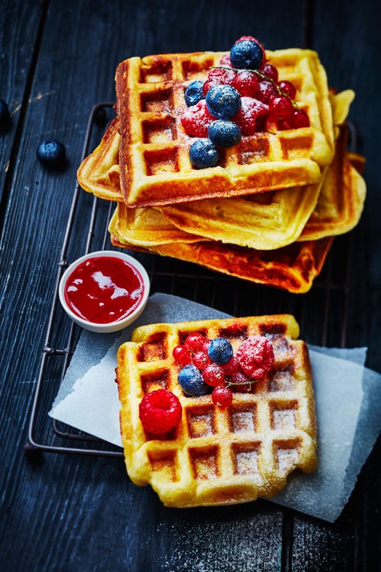 Servez vos gaufres de pommes de terre accompagnées d’un coulis de fruits rouges.