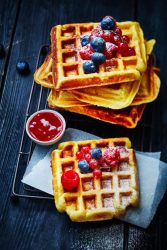 - Servez vos gaufres de pommes de terre accompagnées d’un coulis de fruits rouges.