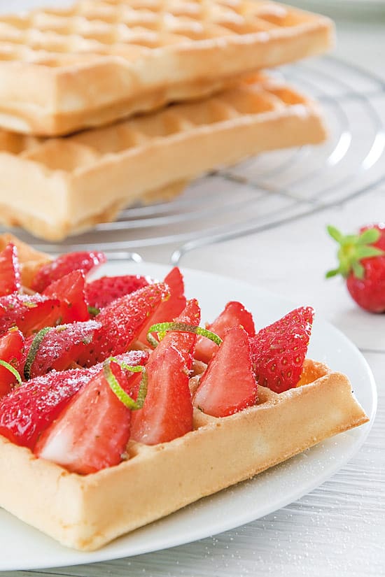 Garnir les gaufres à chaud de fraises marinées au citron vert et poudrer d’un voile de sucre glace. A déguster aussitôt !