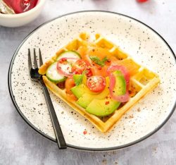 Gaufres de courgette au saumon, avocat, concombre et pickles d’oignon rouge