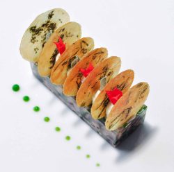 Après 1h30 de cuisson, égoutter la viande. Garder le jus de cuisson. Tailler le chevreau en salpicon. Mouler dans des moules en silicone rectangulaires avec des câpres et des cornichons en brunoise et la livèche ciselée. Recouvrir avec du jus de cuisson clarifié et réserver en chambre froide 24 heures.