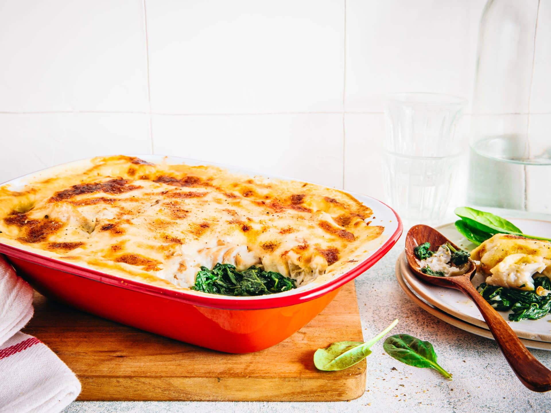 - Dans un plat à gratin, disposez les épinards au fond. Répartissez les morceaux de poisson par-dessus, puis nappez de béchamel. Parsemez de fromage râpé.