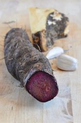 - Peler l’igname et le détailler en cubes (idéalement avec des gants en latex car il peut être pour certaines personnes, urticant). Le cuire à l’eau bouillante salée et parfumée de 2 gousses d’ail et d’une feuille de 4 épices, environ 20 min.