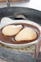 - Dans des plats à œufs, déposer 2 demi-poires puis verser la préparation au chocolat.