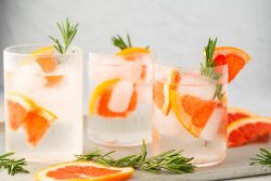 - Couper le pomelo en fines rondelles à la mandoline ou délicatement au couteau aiguisé.Placer les rondelles au fond de la carafe avec la branche de romarin.