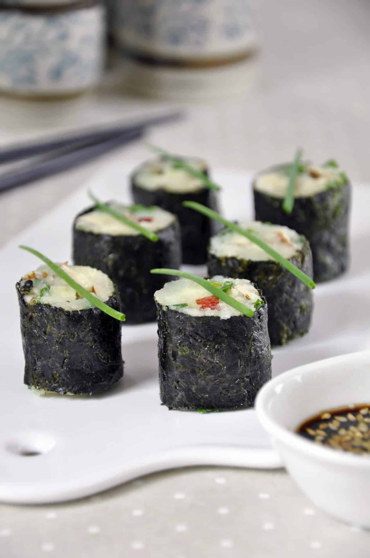 - Poser une feuille de nori sur une natte à maki (ou sur un film alimentaire étirable). Répartir un peu de purée de pomme de terre sur la moitié de la feuille en longueur.