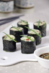 - Dans une coupelle, mélanger la sauce soja, l’huile de sésame grillé et les graines de sésame. Servir les makis accompagnés de cette sauce.