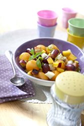 - Dans un saladier mélanger ces fruits au raisin égrené, aux prunes ouvertes en deux, dénoyautées et coupées en petits quartiers. Citronner avec le jus d'un citron.