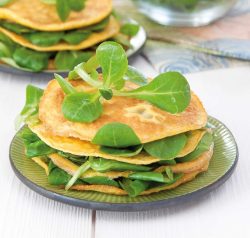 - Y déposer une couche de salade de mâche, déposer dessus une autre omelette puis une couche de salade et terminer par la dernière omelette.