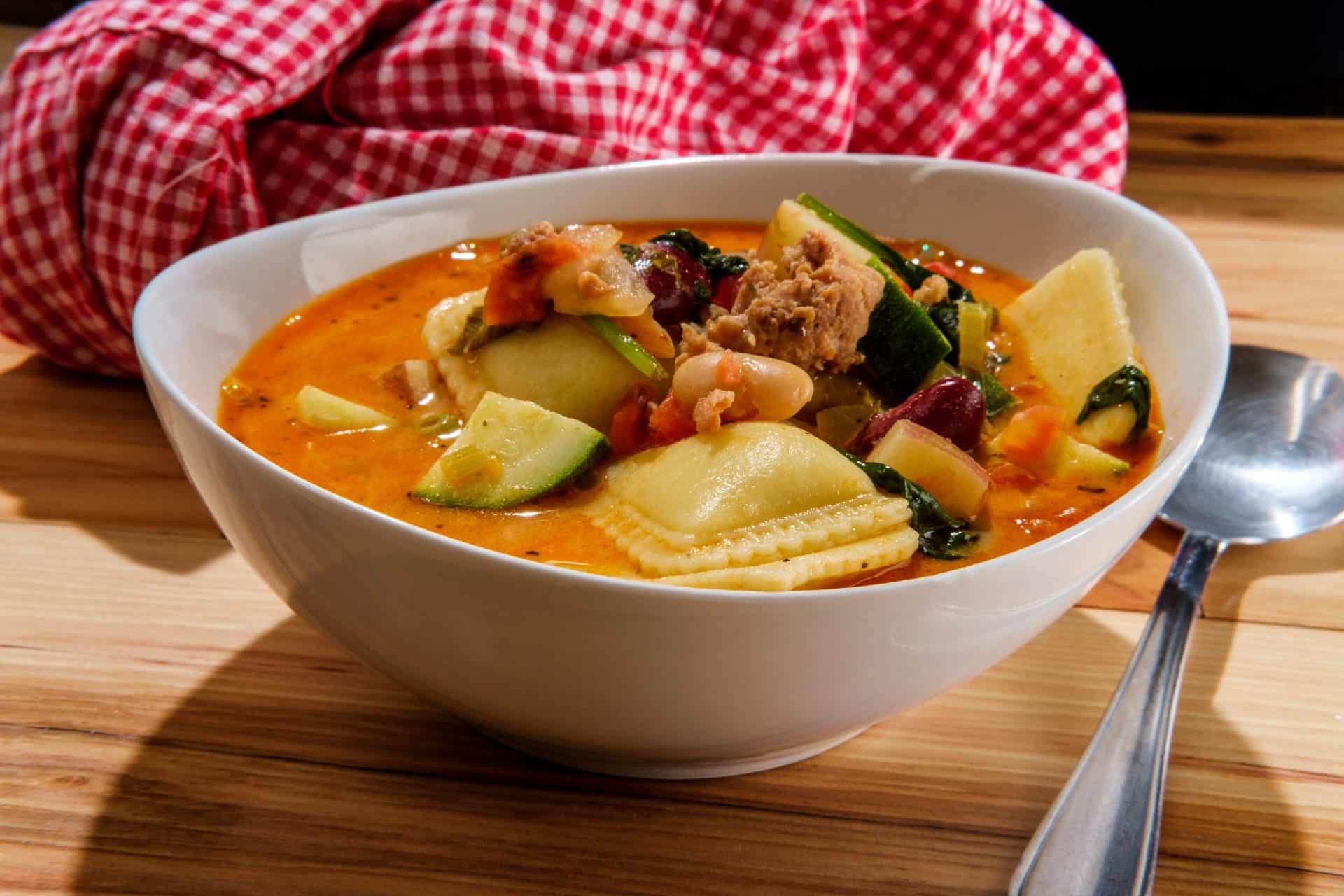 Servir le minestrone dans chaque assiette creuse (ou dans de grands bols) et répartir dessus les ravioles dorées.