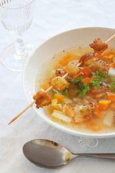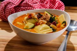 - Servir le minestrone dans chaque assiette creuse (ou dans de grands bols) et répartir dessus les ravioles dorées.