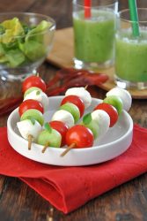 - Disposer sur les piques, en alternant : 1 bille de concombre, 1 tomate cerise, 1 bille de mozzarella, jusqu’à épuisement des ingrédients.