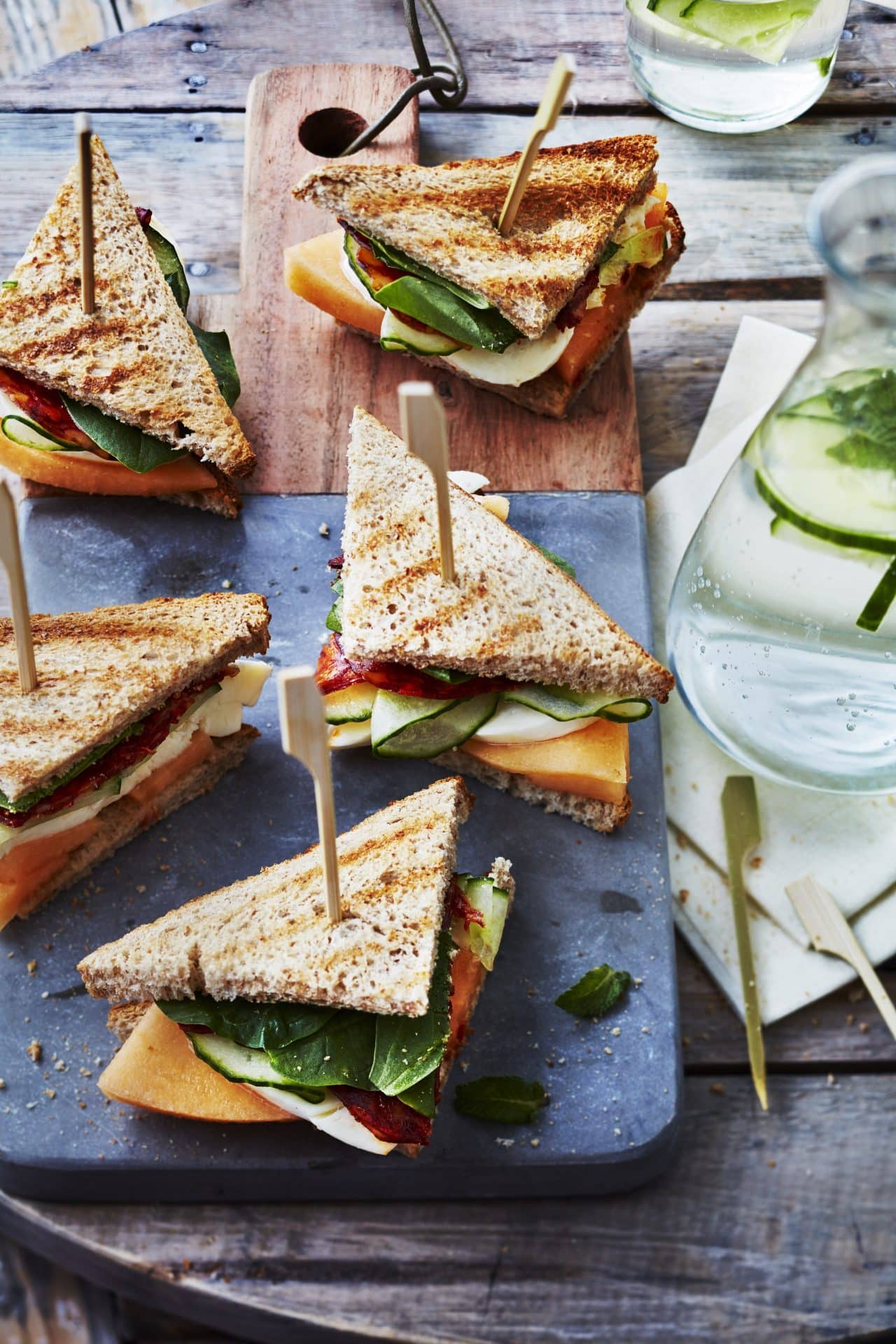 • Sur une tranche de pain, déposer un peu de melon, de la mozzarella, des lamelles de concombre et des tranches de chorizo. Terminer avec des jeunes pousses et quelques feuilles de menthe.