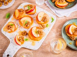 - À la sortie du four, déposez un peu de crème fraîche sur les rondelles de patate douce. Répartissez les morceaux de fromage, les lamelles de pommes et les cerneaux de noix. Poivrez, arrosez d’un filet de miel et remettez au four pour 10 minutes.